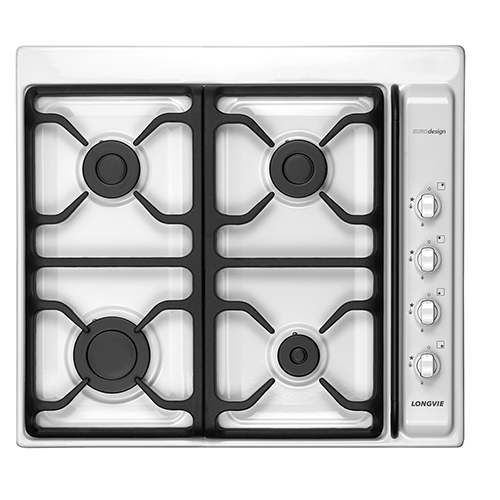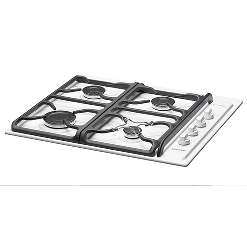 Anafe blanco de 60 cm, encastrable con encendido electrónico a una mano y rejas de hierro fundido.