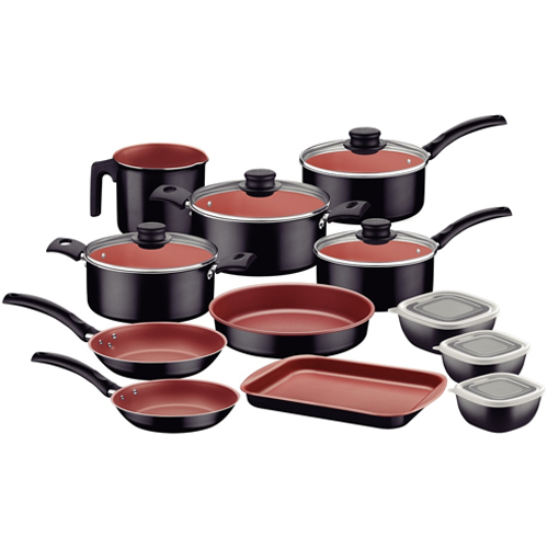 El contenido de la Batería de Cocina Tramontina 12 Piezas Turim 27899/496 incluye ollas, cacerolas, sartenes, asaderas, hervidor y contenedores con tapa, conformando un kit completo y versátil para el día a día.