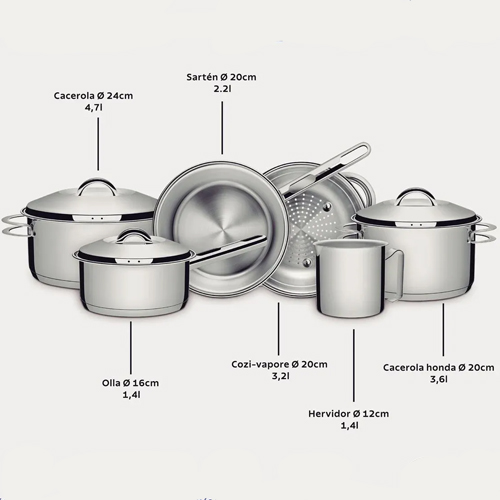El contenido de la Batería de Cocina Tramontina 6 Piezas Solar 65510/200 incluye una cacerola de 24 cm y 4,7 litros, una cacerola de 20 cm y 3,6 litros, una vaporera de 20 cm y 3,2 litros, una sartén de 20 cm y 2,2 litros, un jarrito de 12 cm y 1,4 litros, además de una olla de 16 cm y 1,4 litros.