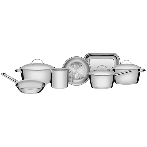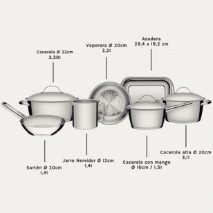 El contenido de la Batería de Cocina Tramontina 7 Piezas Allegra 65650/170 incluye olla, cacerolas hondas, sartén, vaporera, jarro y bandeja para servir, brindando todo lo necesario para cocinar desde platos simples hasta elaboraciones más complejas.