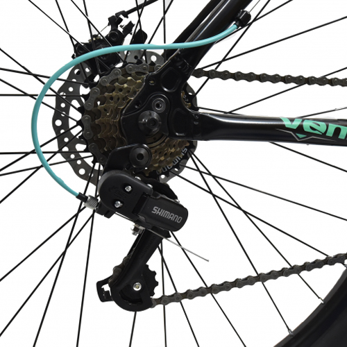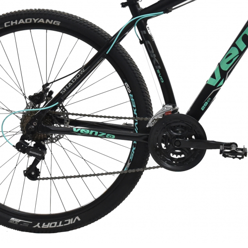 La BICICLETA VENZO R29 MTB LOKI EVO SHADOW cuenta con componentes Shimano en su sistema de transmisión, incluyendo la pata de cambio, piñón, plato, palanca, descarrilador y manijas de freno y cambio, asegurando durabilidad y precisión en cada pedaleo. Su cadena KMC refuerza su desempeño confiable.