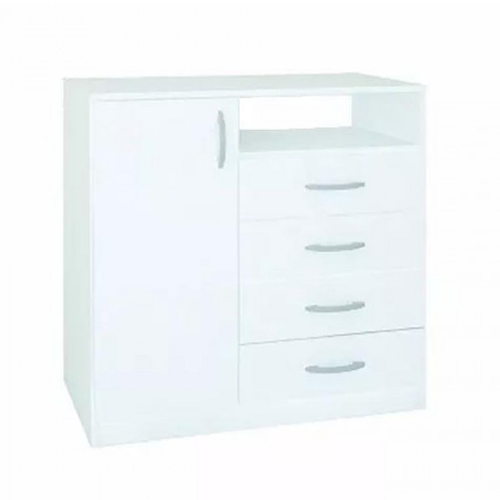 Una cómoda realmente funcional, con armario de mediana altura con 3 estantes regulables, 4 amplios cajones con correderas metálicas y 1 estante superior. Es uno de los muebles que no puede faltar en tu habitación.