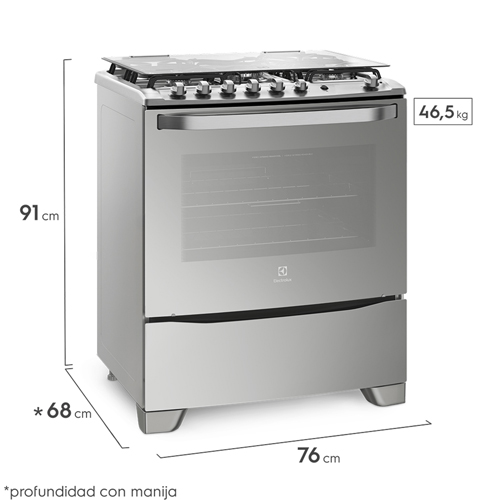Las medidas de la Cocina Electrolux Inox 76GSR son de: 76 cm de ancho, 91 cm de alto y 68 cm de profundidad.
