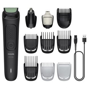 Equipado con 10 accesorios enjuagables, el Cortabarba Philips Multigroom MG3931/15 ofrece múltiples opciones de grooming para cabello, barba, cuerpo e higiene íntima. Incluye funda simple, cepillo de limpieza y cubierta de precisión con ajustes finos de 0,5 a 16 mm.