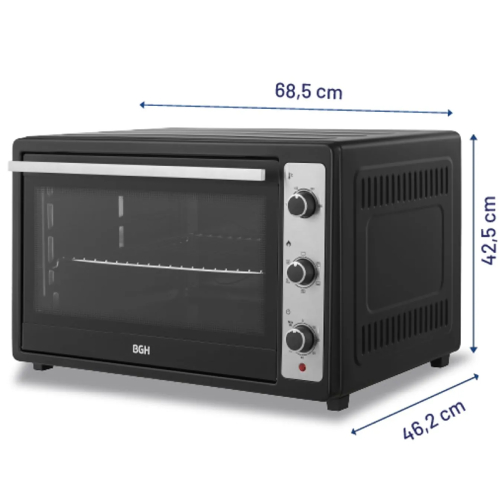 El Horno Eléctrico BGH Mecánico 80L Convección BHE80M25I ofrece un rango de temperatura ajustable entre 100 °C y 250 °C, e incluye bandeja, rejilla y bandeja recolectora de migas para mayor practicidad. Con un diseño moderno en color negro, potencia de 2200W y dimensiones de 68,5 × 42,5 × 46,2 cm, combina eficiencia y estilo en tu cocina.