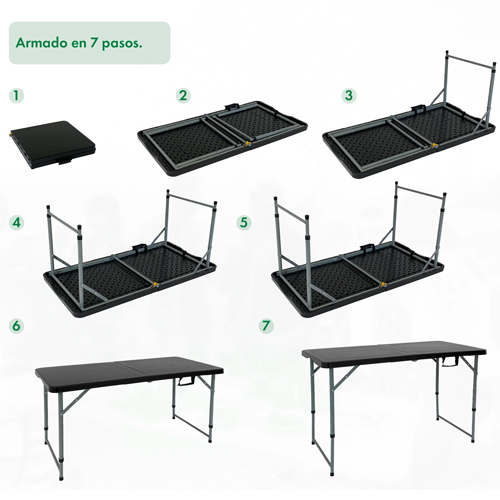Con una longitud de 1,20 metros, la Mesa Camping Plegable Garden Life 1,20m T403501 ofrece un espacio cómodo para compartir comidas, juegos o actividades con familia y amigos. Su estructura permite ajustar la altura según la necesidad, adaptándose tanto a adultos como a niños.