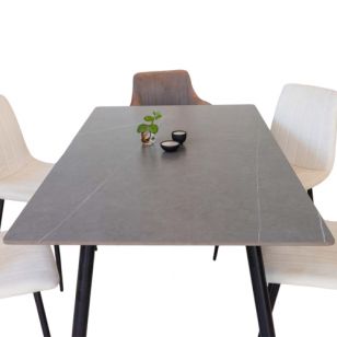 La estructura de la Mesa Piedra Símil Natural Avelino Zoe Gris cuenta con patas metálicas en color negro con terminación en pintura en polvo, lo que aporta solidez y un estilo contemporáneo. Esta combinación de materiales garantiza una base firme, capaz de resistir el uso cotidiano sin perder estética ni funcionalidad.