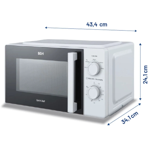 Compacto, seguro y funcional, el Microondas BGH 18L Mecánico B118MB25 combina estilo clásico con eficiencia moderna. Con medidas de 43,4 × 24,1 × 34,1 cm y un peso de 6,6 kg, es la elección perfecta para quienes desean un microondas versátil y fácil de integrar en cualquier cocina.
