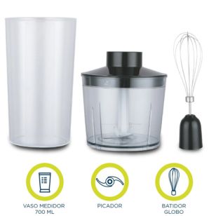 Incluye vaso picador lavable, vaso medidor con pico vertedor y batidor de alambre, lo que convierte al Mixer Smart-Tek 1000W MP1000 en un aliado completo para batir, picar y emulsionar. Su diseño ergonómico mejora la experiencia de uso.