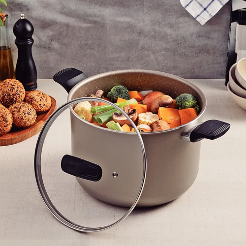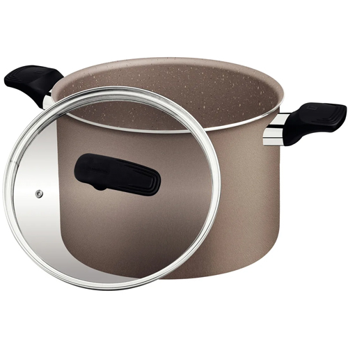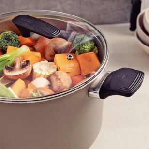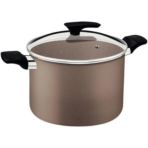 Gracias a su revestimiento interno y externo antiadherente Starflon Premium, la Olla Alta Tramontina 26 cm Milazzo 28574/426 evita que los alimentos se adhieran y facilita una limpieza mucho más rápida. Este material está libre de PFOA, cuidando tanto tu salud como el medio ambiente. Su tapa de vidrio templado con salida de vapor permite controlar la cocción sin necesidad de levantarla, mientras que su borde de acero inoxidable le aporta mayor durabilidad.