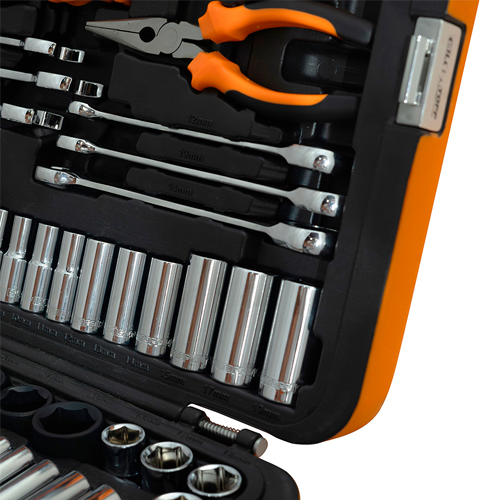 Para mayor versatilidad, el kit incluye una selección de puntas en diversos formatos (Torx, Hex, PZ, PH, entre otros), barras de extensión, adaptadores y saca bujías, lo que permite abordar una gran variedad de trabajos. Asimismo, cuenta con alicates de acero al carbono y de punta larga, y destornilladores cruz y planos en tamaños prácticos para tareas cotidianas o especializadas.
