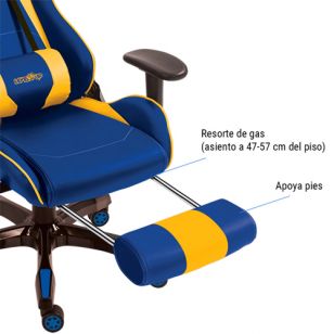 La Silla Gamer Level Up Boca Juniors incorpora chasis multifuncional con resorte de gas, apoya pies retráctil y un marco de acero resistente que soporta hasta 90 kg, ofreciendo una estructura sólida y funcional para uso intensivo.