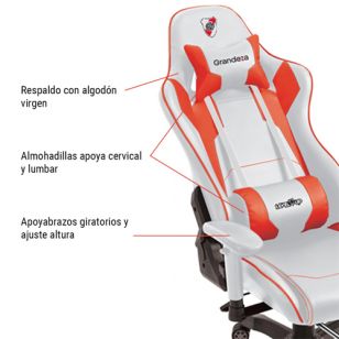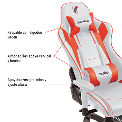 La Silla Gamer Level Up River Plate está diseñada para ofrecer el máximo confort durante largas sesiones de juego o trabajo. Su respaldo acolchonado con algodón virgen y las almohadillas cervical y lumbar aseguran una postura ergonómica, ideal para mantener la comodidad durante horas.