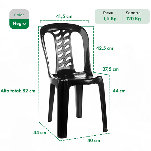 Liviana y apilable, su altura total de 82 cm y peso de solo 1,5 kg facilitan el traslado y almacenamiento. La Silla Plástica Reforzada Garden Life Bistró F850001 Negra se limpia fácilmente, lo que la convierte en una opción práctica para uso diario.