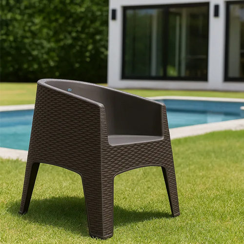 El Sillón Voss Oasis Simil Ratan combina comodidad y estilo en un diseño plástico con terminaciones que imitan el rattan, ideal para balcones, patios y espacios al aire libre. Su estética moderna aporta calidez y practicidad.