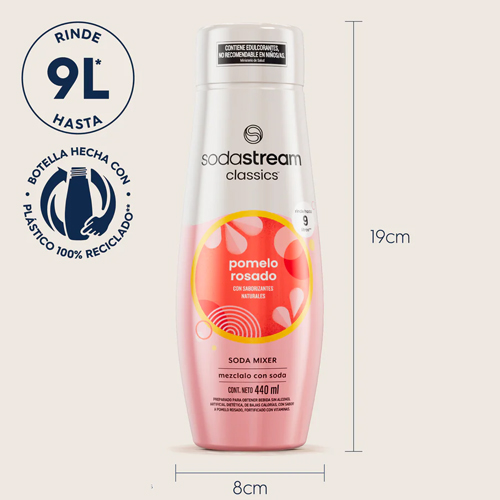 Con un contenido neto de 440 ml, el Soda Mixer Pomelo Rosado Sodastream rinde hasta 9 litros de bebida saborizada. Solo tenés que gasificar el agua, agregar una medida del sabor, mezclar y disfrutar. Simple, rápido y divertido.