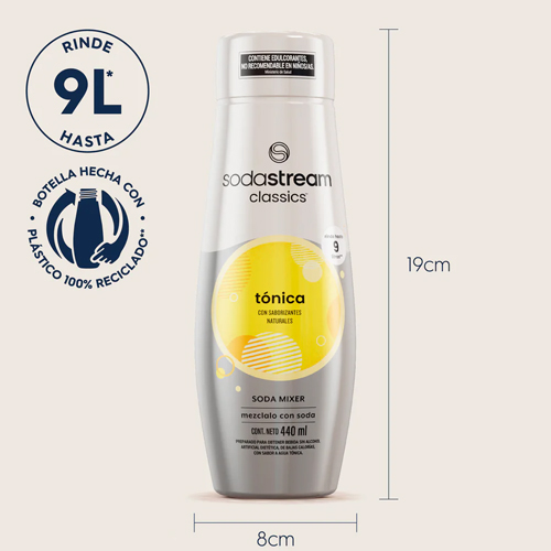Con un contenido neto de 440 ml, el Soda Mixer Tónica Sodastream rinde hasta 9 litros de bebida saborizada. Solo tenés que gasificar el agua, agregar una medida del sabor, mezclar y disfrutar. Simple, rápido y divertido.