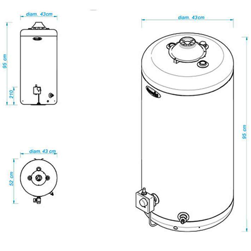 Las medidas del Termotanque Escorial 80L son de: 42.5 cm de diámetro y 95cm de altura. Posee un peso de 27 kg vacío.