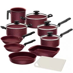 El set de la Batería de Cocina Tramontina 10 Piezas Turquia 27899/426 incluye una amplia variedad de utensilios: dos sartenes de 16 y 20 cm, dos cacerolas de 18 y 20 cm, dos ollas de 14 y 16 cm, un hervidor de 12 cm, un molde para hornear de 22 cm, una asadera rectangular onda de 22 cm y una tabla de corte. Esta diversidad de piezas permite cubrir desde tareas básicas hasta recetas más elaboradas.