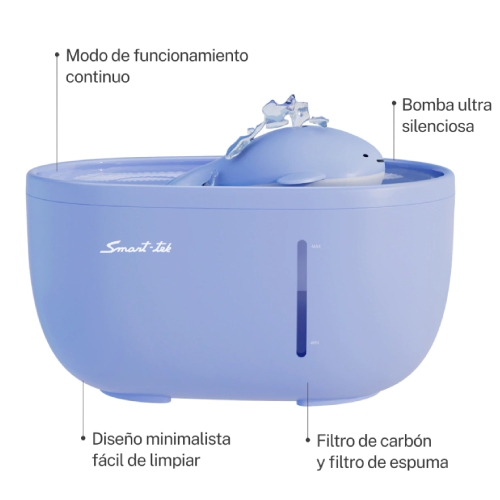 El Bebedero Automático Para Mascotas 2L Smart-Tek PW30 está diseñado para perros y gatos, con una capacidad de 2 litros que asegura hasta 6 días de agua para un gato adulto. Su modo de funcionamiento continuo proporciona un flujo constante de agua fresca, contribuyendo a la salud y bienestar de tu mascota.