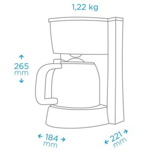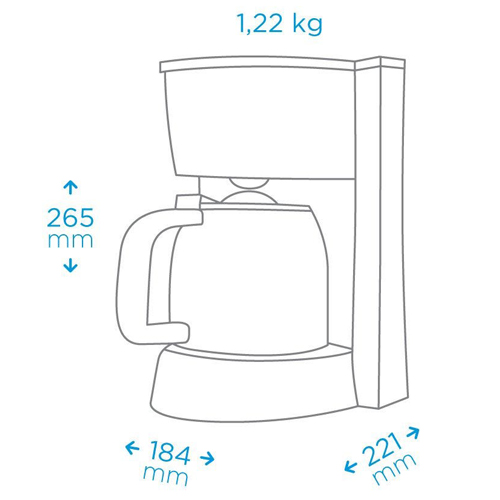 Las medidas de la Cafetera Midea CM-M110BAR1 son de: 18,4 cm de ancho; 26,5 cm de alto y 22,1 cm de profundidad. Posee un peso de 1,22 kg.