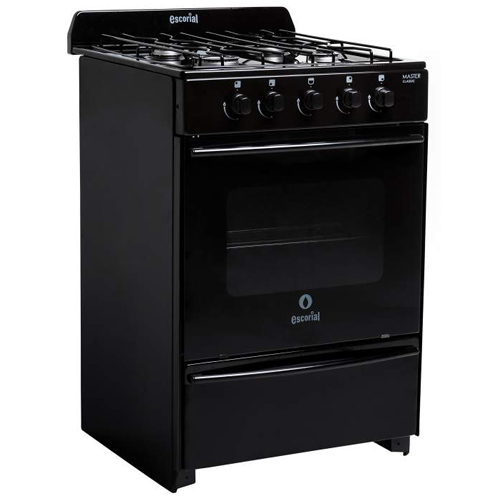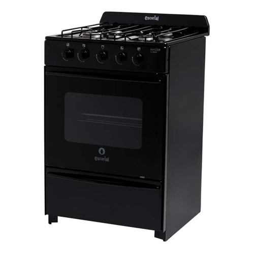 La Cocina Escorial Enlozada Negra G envasado Master Classic posee 4 hornallas (3 medianas y una grande) y quemadores de aluminio pulidos con tapa de acero esmaltada. También cuenta con válvula de seguridad en hornallas y horno.