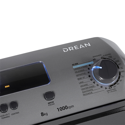 El Lavarropas Automático Drean Carga Superior 8Kg 1000 Rpm LTDR0810PI0 cuenta con carga autoadaptativa y sistema autobalance que ajustan automáticamente el consumo de agua y equilibran las prendas durante el centrifugado. Además, ofrece inicio diferido hasta 24 horas, bloqueo para niños, lavado rápido en 30 y 45 minutos, y 23 programas configurables mediante su display LED multifunción y perilla bidireccional transiluminada, lo que facilita el uso y adapta el lavado a cada necesidad.