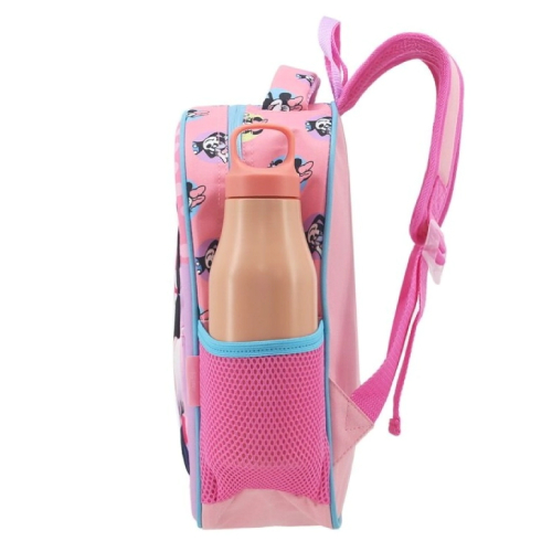 La Mochila Cindy Infantil Disney Minnie incluye portabotella lateral, ideal para mayor practicidad en el día a día. Con un tamaño de 12”, resulta compacta y cómoda para llevar útiles escolares o accesorios personales.