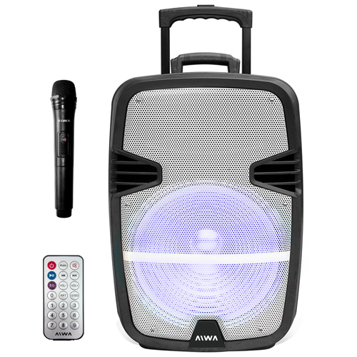 El Parlante Portátil Aiwa 7000W AW-P1510D cuenta con un control remoto y con un micrófono inalámbrico, los cuales te pueden ayudar en diferentes tipos de escenarios, ya sea para dar conferencias, para cantar con su modo Karaoke o mismo para musicalizar tu negocio o tu fiesta.