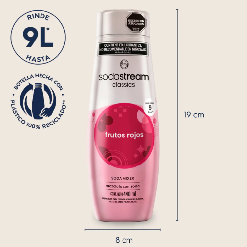 El Soda Mixer Frutos Rojos Sodastream está elaborado con azúcar y pensado para quienes buscan variedad y practicidad en sus bebidas. Recordá siempre gasificar el agua antes de añadir el sabor, para obtener el mejor resultado y disfrutar al máximo de la experiencia Sodastream.