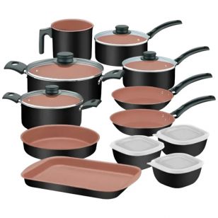 El contenido de la Batería de Cocina Tramontina 12 Piezas Turim 27899/496 incluye ollas, cacerolas, sartenes, asaderas, hervidor y contenedores con tapa, conformando un kit completo y versátil para el día a día.