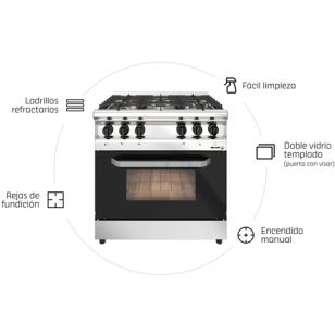 El horno de gran capacidad de la Cocina Industrial Morelli 82cm 5H Capri 22062 cuenta con piso de tejuelas refractarias y puerta con doble vidrio templado, ofreciendo 4500 calorías para cocciones potentes y uniformes.