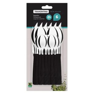 El Juego de Cubiertos Tramontina 24 Piezas 23198/094 Negro combina elegancia, resistencia y diseño moderno, ofreciendo un conjunto completo para seis personas que realza cualquier mesa.