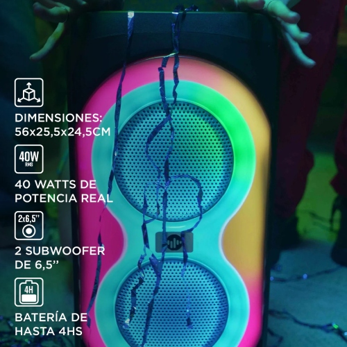 El Parlante Portátil Stromberg 60W Lumos 2 integra luces LED que transforman cualquier espacio en un espectáculo audiovisual. Sus controles de bajos y agudos ajustables, junto con efectos de voz, permiten personalizar la experiencia musical. Además, gracias a Stromberg Connect, se puede enlazar con otro parlante de la misma familia para crear un efecto estéreo envolvente.