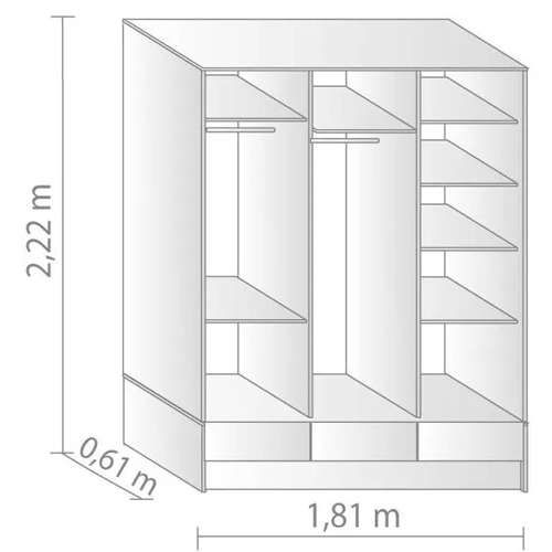 Las medidas del Placard Platinum 3 Puertas Corredizas 635 Blanco son 1,81 m de largo, 2,22 m de alto y 0,61 m de profundidad, lo que lo convierte en una solución amplia sin ocupar demasiado espacio. Su diseño en color blanco aporta luminosidad y se adapta a distintos estilos de decoración.