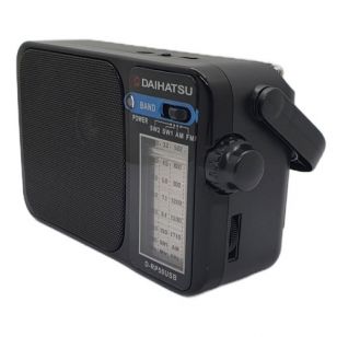 La Radio Daihatsu D-RP50USB cuenta con indicador de encendido y de frecuencia, es Dual FM/AM. La alimentación es a través de USB o pilas recargables. Posee antena y USB-DC5V.