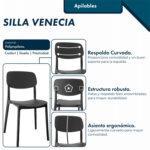 La Silla de Diseño Garden Life Venecia F914001 Negra combina estilo y funcionalidad en una estructura moderna, ideal para interiores o espacios semicubiertos. Su diseño limpio y minimalista se adapta a diferentes ambientes, ofreciendo una opción estética y práctica tanto para comedores, escritorios como salas de espera.